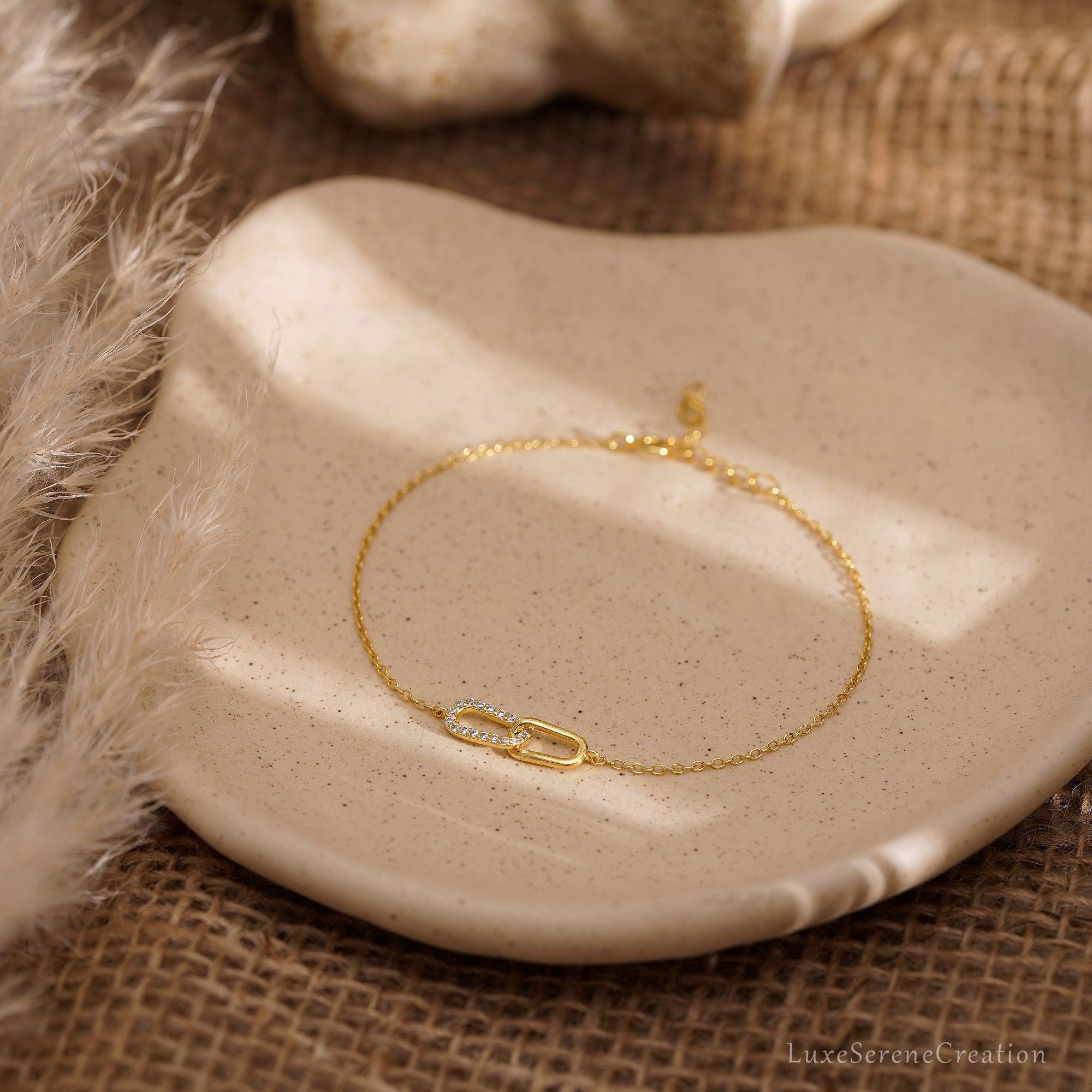 14K Gold Pave Paperclip Chain Bracelet, Minimalist Cross-Over Bracelet for Women, Double Buckle Sterling Silver Bracelet, Christmas Gift