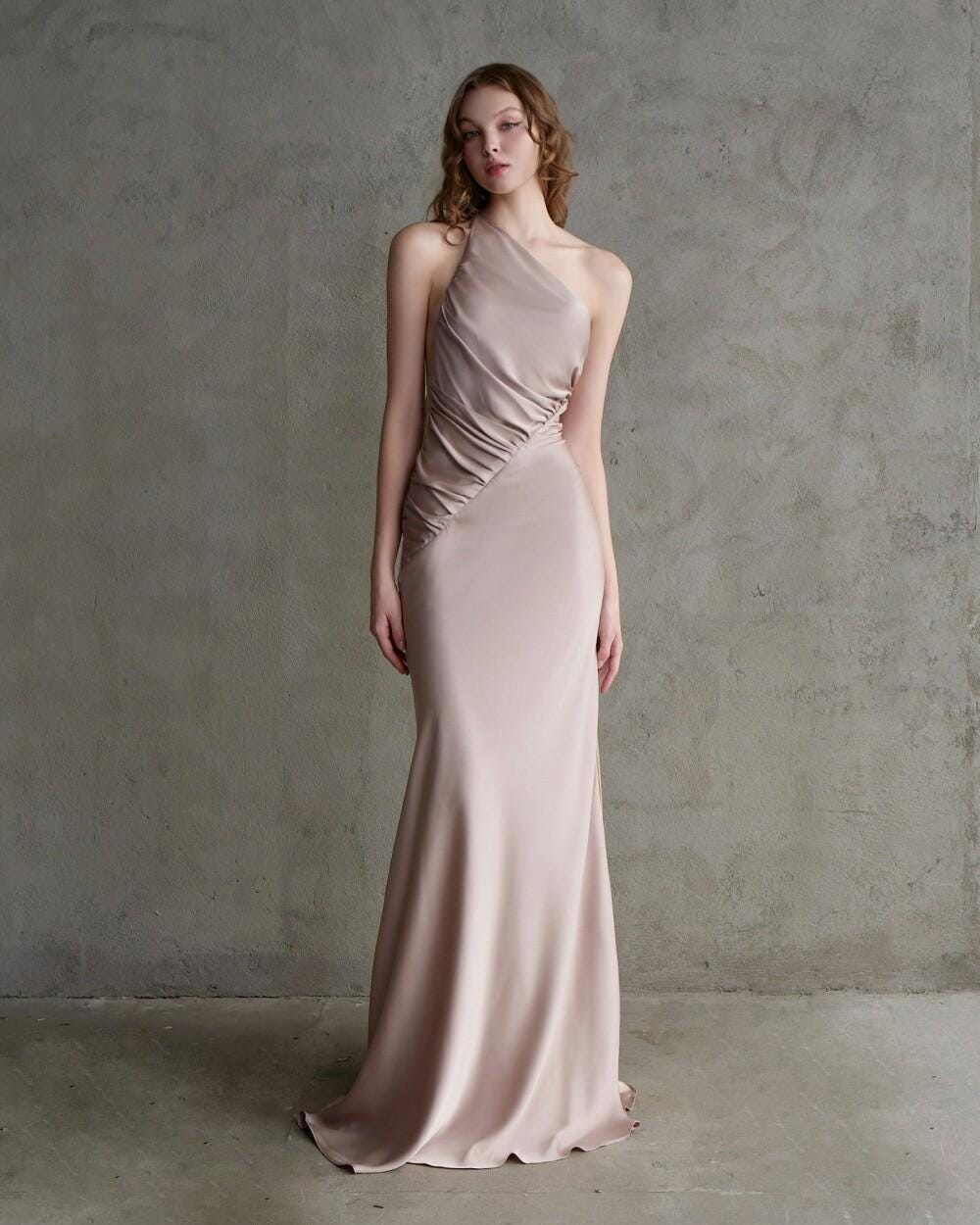 Elegant One Shoulder Ruched Satin Gown For Wedding