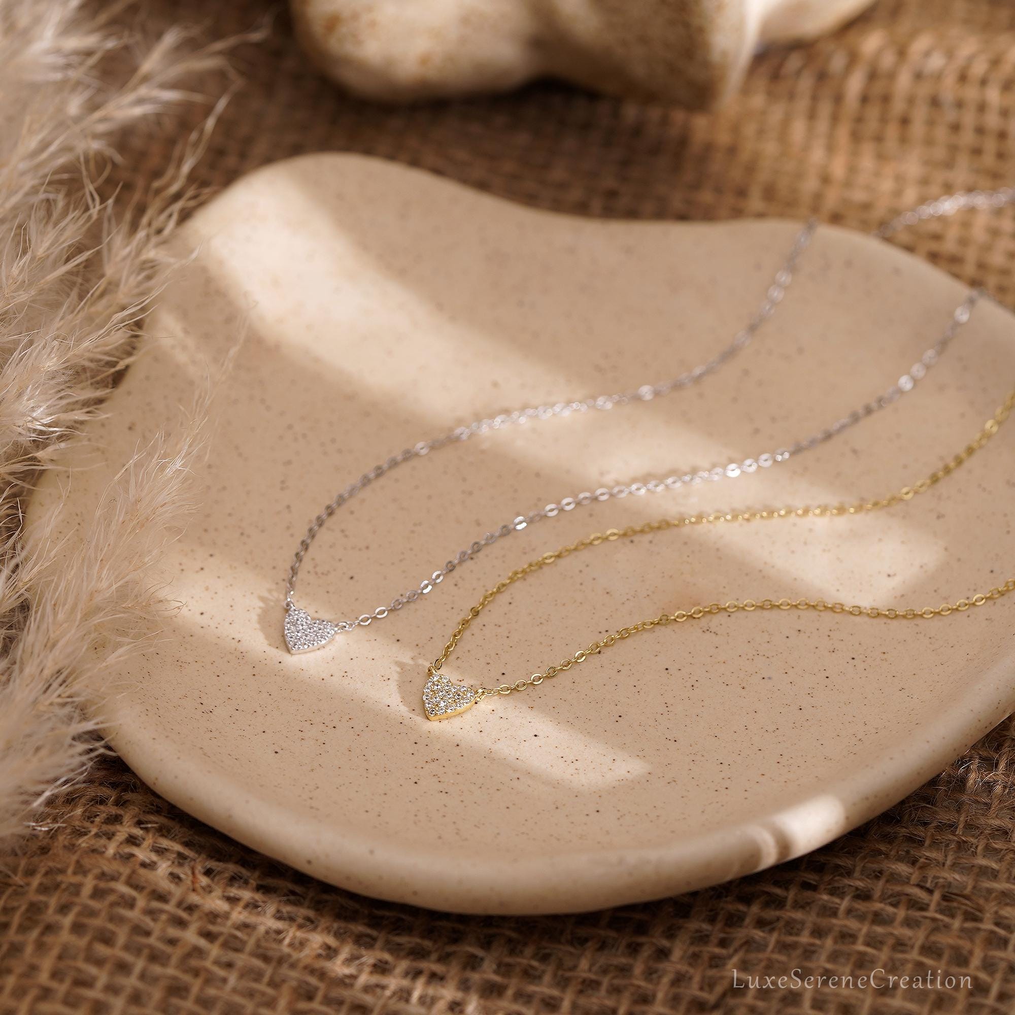 Minimalist Pave Heart Necklace, Sterling Silver Heart Pendant Necklace, Tiny Minimalist Pave Diamond Necklace for Woman, Christmas Gift